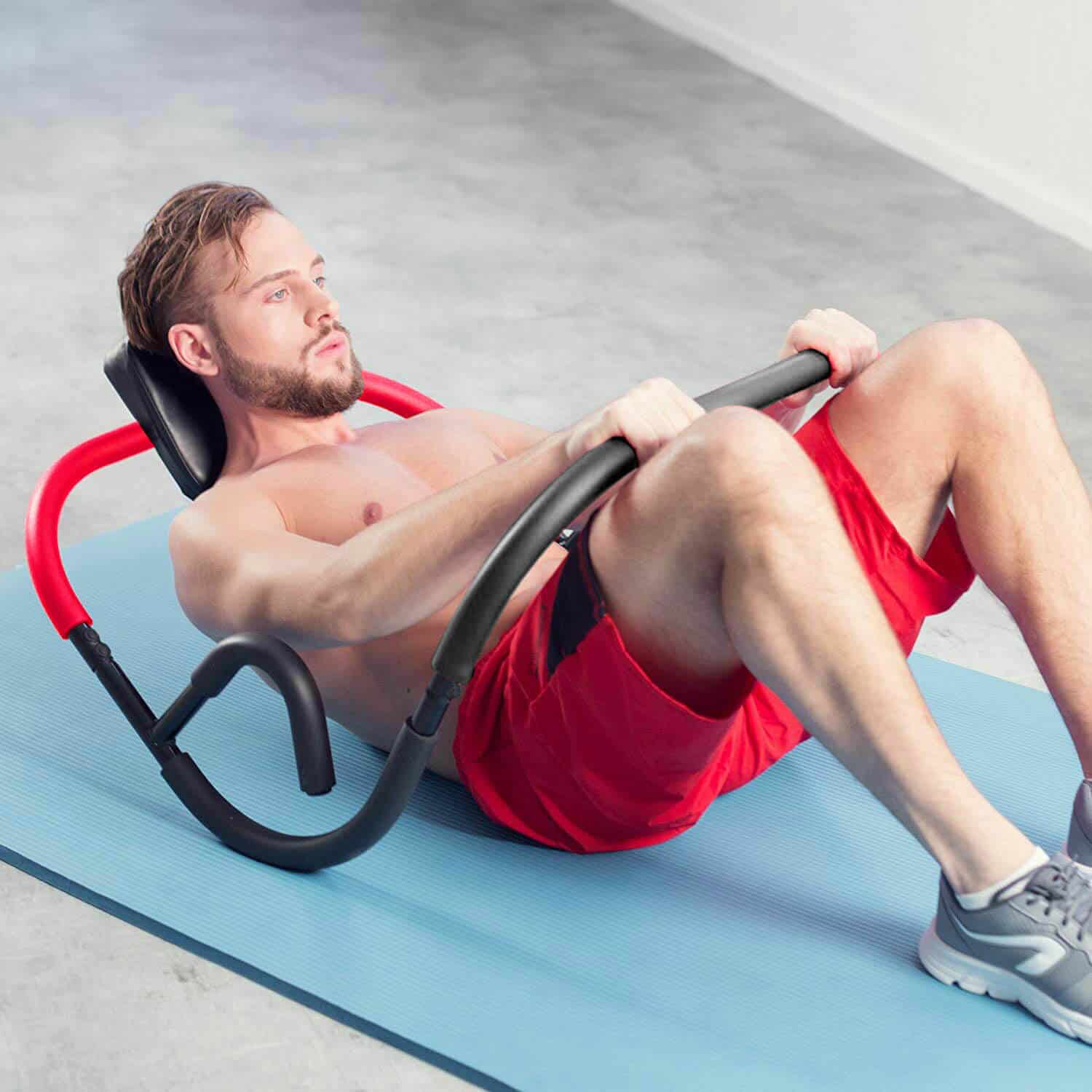 1. Lie down with your head on the headrest. Place the ab rocker on the floor with the headrest behind you. Lie down on your back inside the rocker so that your head is resting on the headrest and the upper roll bar is positioned above your chest.
