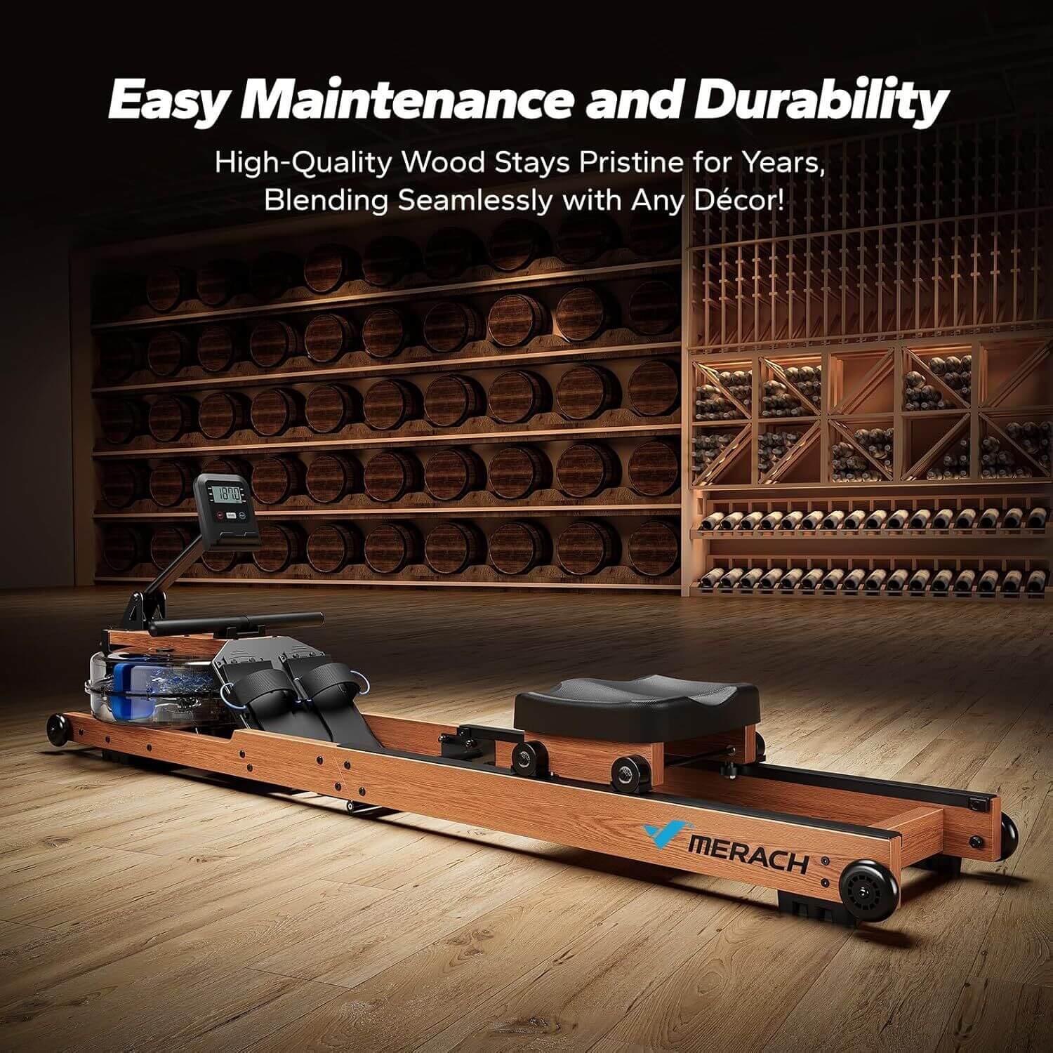 The MERACH water resistance rowing machine is crafted from durable solid wood, offering excellent stability and a 180 kg (400 lbs) weight capacity.