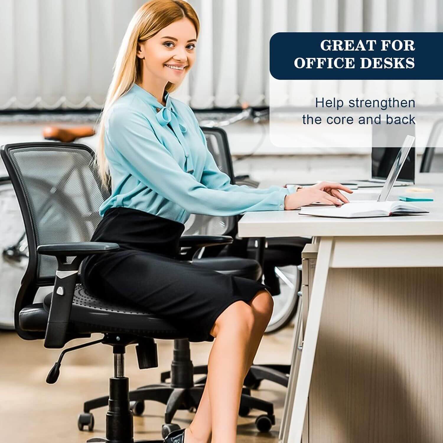 Balance Wobble Cushion helps to fix some of the backpain problems from passive sitting. Sitting for long periods can increase stiffness in the lower back, create pressure on lumbar intervertebral discs and lead to tightening of the hip flexors leading to weakening the glutes, abdominals and core muscles.