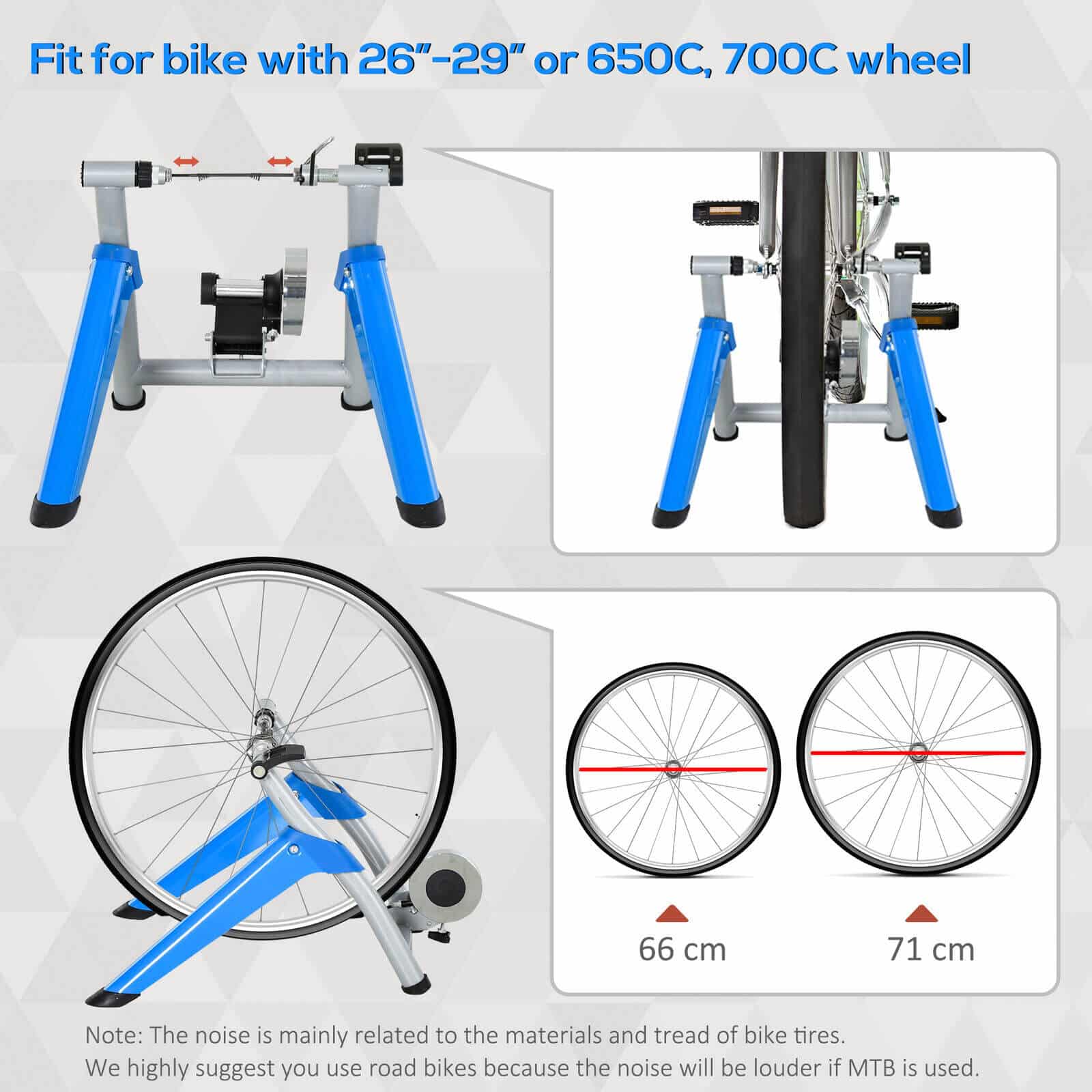 - Connectivity: Compatible with most 26-29 in and 650C, 700c wheels. (Note: Noise levels are related to the materials and tread of bike tyres. We recommend you use road tyres because the noise will be louder if MTB is used.)