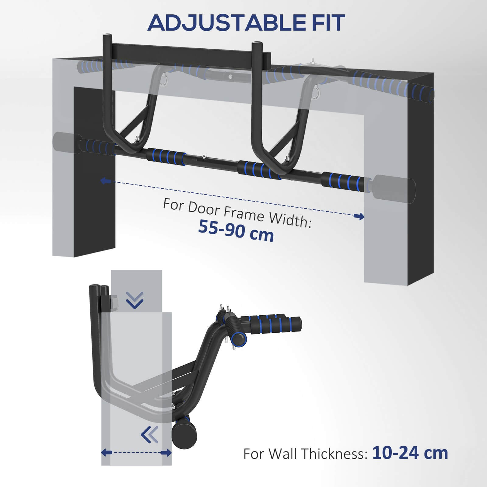 - Adjustable fit: This chin-up bar fits door frames 55-90cm wide and mounts securely on concrete and brick walls 10-24cm thick.